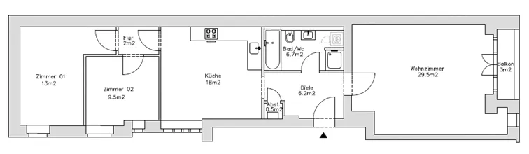 Das Thermostat Bosch CR100 befindet sich im Wohnzimmer (siehe Grundriss). Die Wohnung ist schlauchförmig geschnitten und schlecht gedämmt. Das Schlafzimmer hat 3 Außenwände.